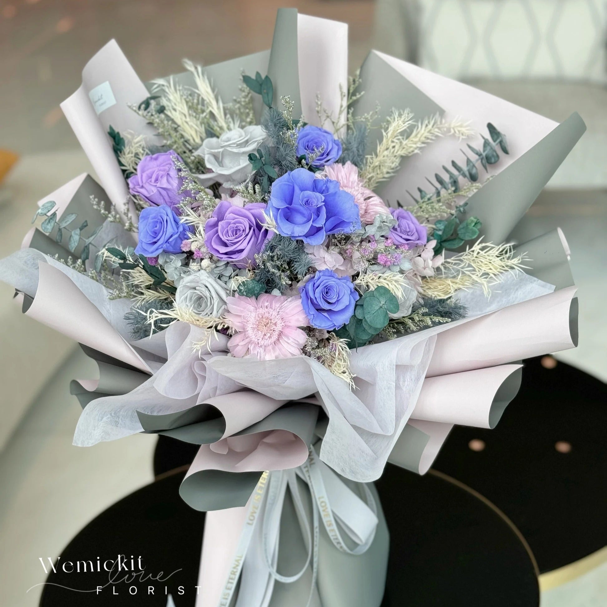 Brighten up your space with this stunning bouquet of purple and blue flowers, elegantly arranged on a table. Perfect for adding a touch of color and charm to any room, this floral display is ideal for special occasions or simply to enjoy the beauty of nature indoors. Each bloom is carefully selected to create a harmonious blend, making it a delightful centerpiece or a thoughtful gift for someone special